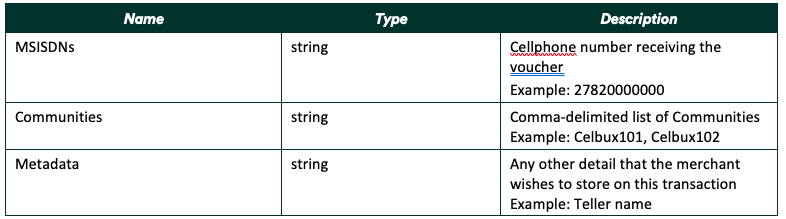 { “Username”: “Merchant1”, “IDNumber”: “”, “Metadata”: “{\”ActionID\”: \”b37beb5b-e5d5-495c-8525-90b275ff4310\”}” } |